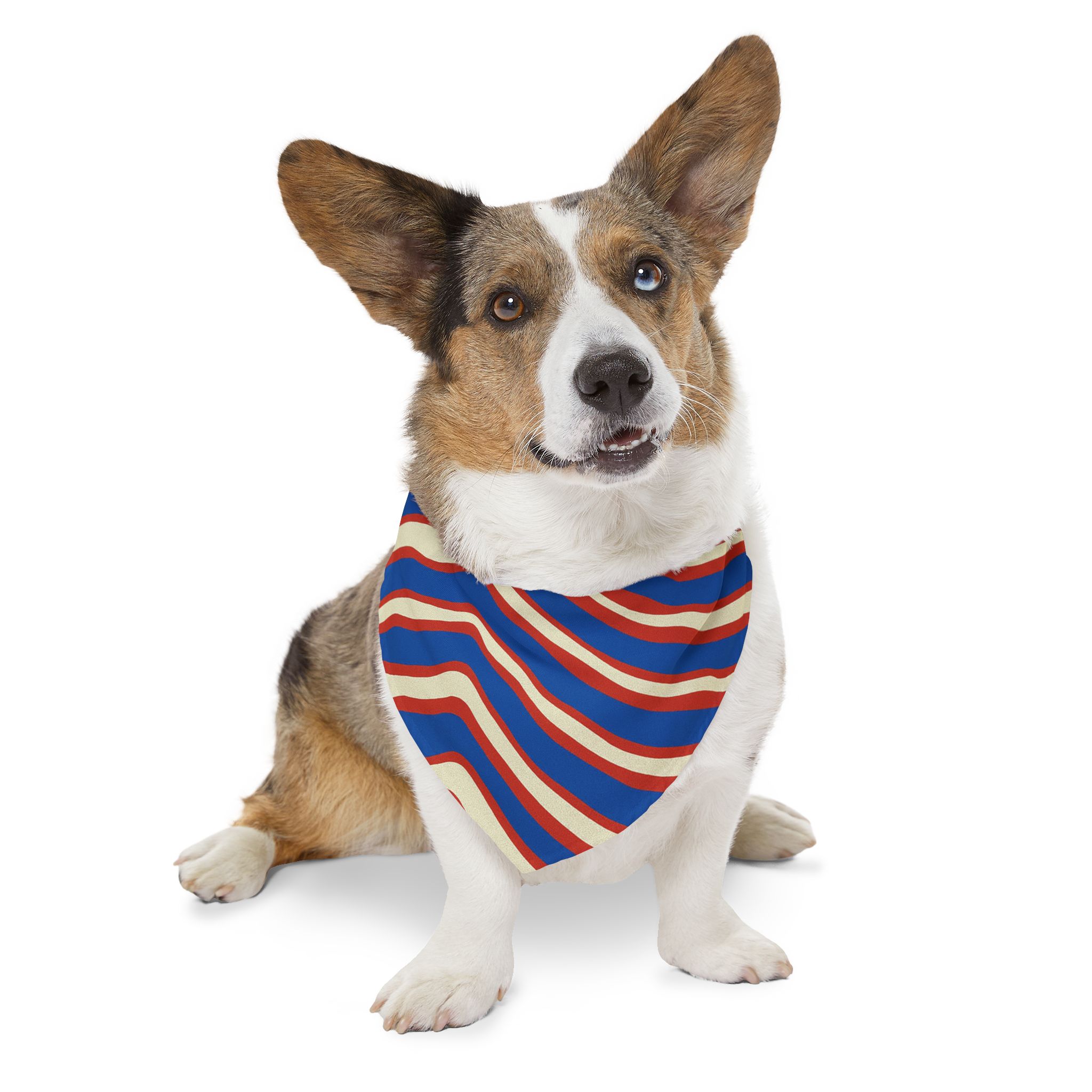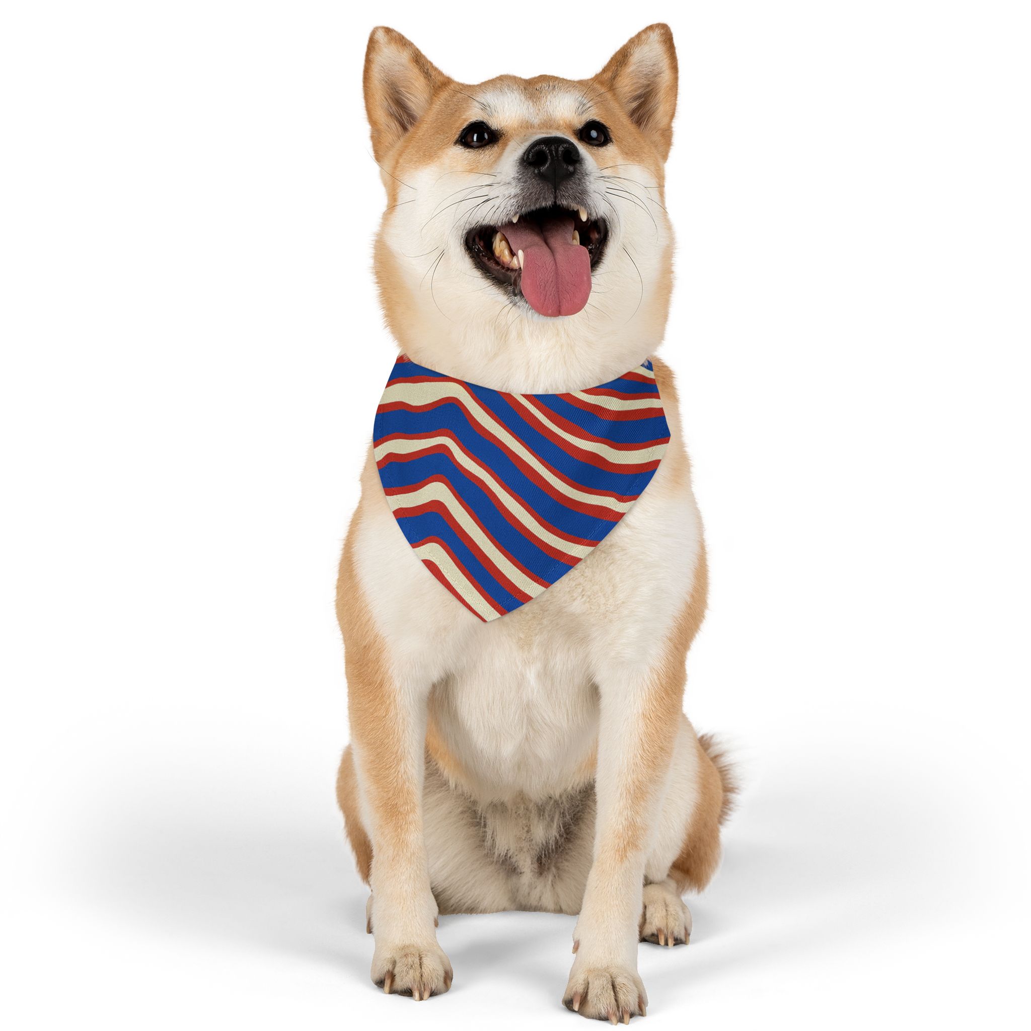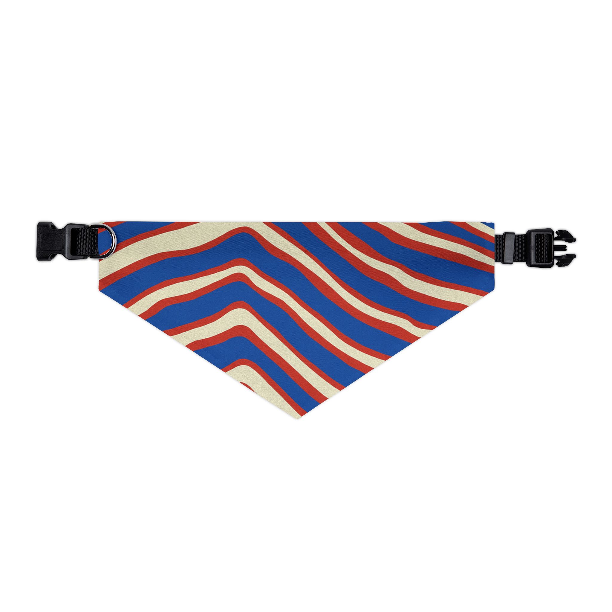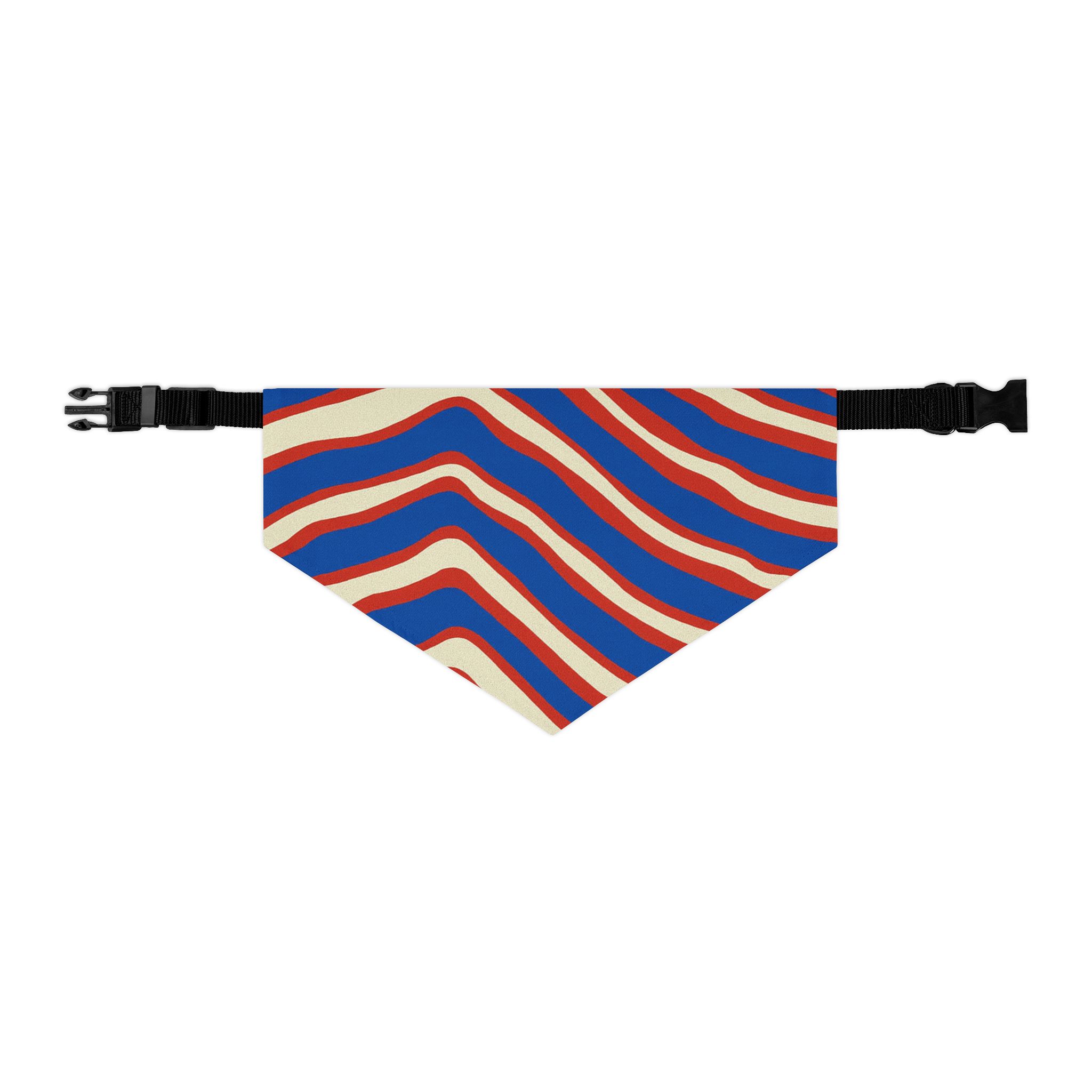 Buffalo 716 This vibrant pet bandana collar brings playful motion to your dog’s wardrobe. The wavy, retro stripes in bold red, blue, and cream create an energetic, vintage-inspired look that sits neatly against the chest. Lightweight polyester keeps the bandana crisp and quick-drying, while the adjustable black collar with a secure buckle clip ensures a comfortable, customized fit for walks, meetups, or photos. Hemmed edges add durability so the print stays sharp through everyday adventures. Slip it on to add color and personality to strolls, gatherings, or casual photoshoots — it looks lively on small pups and medium companion dogs alike.